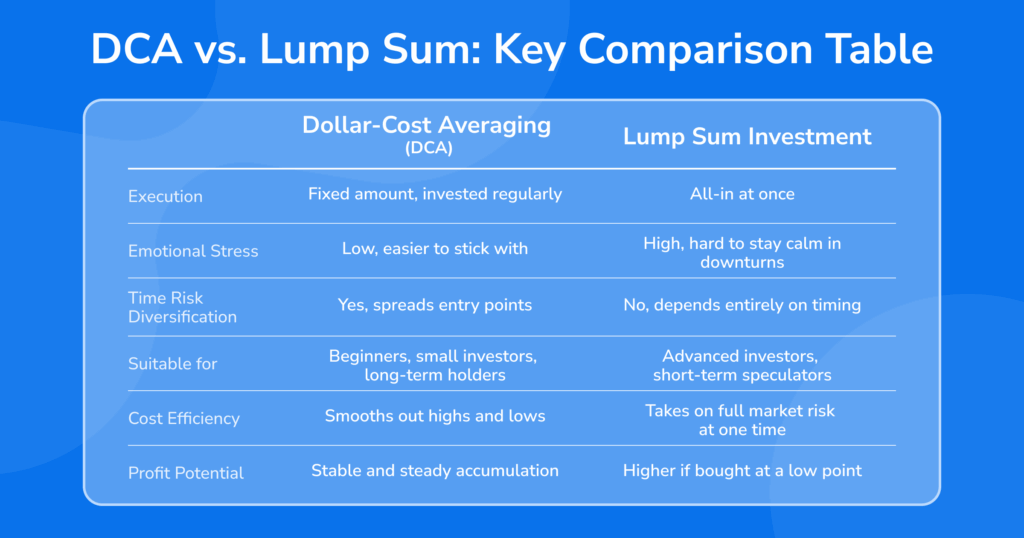 - DCA: Buys cheaper over time. Lower average cost, less painful.